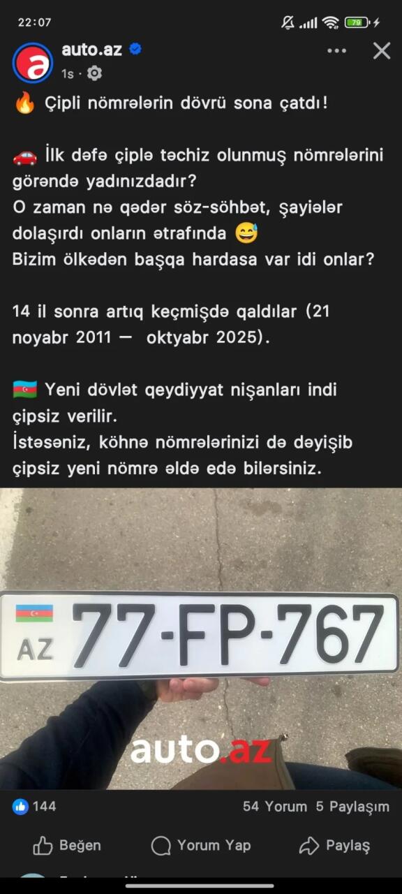 Milli.Az xəbər verir ki, xəbər verir, yeni dövlət qeydiyyat nişanları 2025-ci ildən artıq cipsiz verilir.