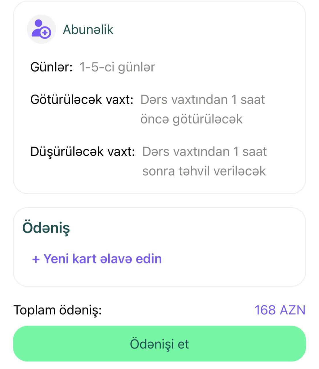 Yasamal rayonu, Əsəd Əhmədov küçəsindən - 132-134 nömrəli məktəbə gediş-gəliş olmaqla aylıq qiymət isə 168 manat təşkil edir.