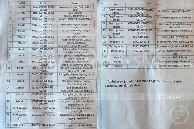 Oğlunun, xüsusən qızının və həyat yoldaşının, qanunsuz qızının, nəvələrinin adına olanlardan hələ danışmırıq. Bu gün onun nəticəsidir ki, Şahəddin Abdullayevin dövlət orqanlarında dayaqları və himayədarları qalmaqda davam edir. İki ilə yaxındır ki, etdiyimiz müraciətlərdə Şahəddin Abdullayevin təsisçisi olduğu və oğlu Şamxal Abdullayevin direktor olduğu "Güzdək Metal" və "Roofs" MMC-də Vergi Məcəlləsinin 38.2-ci maddəsinin tələblərini pozaraq, dövlət büdcəsindən külli miqdarda mənimsəmələr edilməsinə dair göstərdiyimiz faktlar bu günə qədər araşdırılmayaraq açıq qalıb. Bunun nəticəsidir ki, hər 2 müəssisənin rəhbərləri uzun müddətdir ki, "qara mühasibatlıqla" işləyərək dövlət büdcəsindən milyonlarla manat mənimsəmələr etmələrinə baxmayaraq, əl-qollarını sallayaraq sərbəst gəzib dolaşırlar".