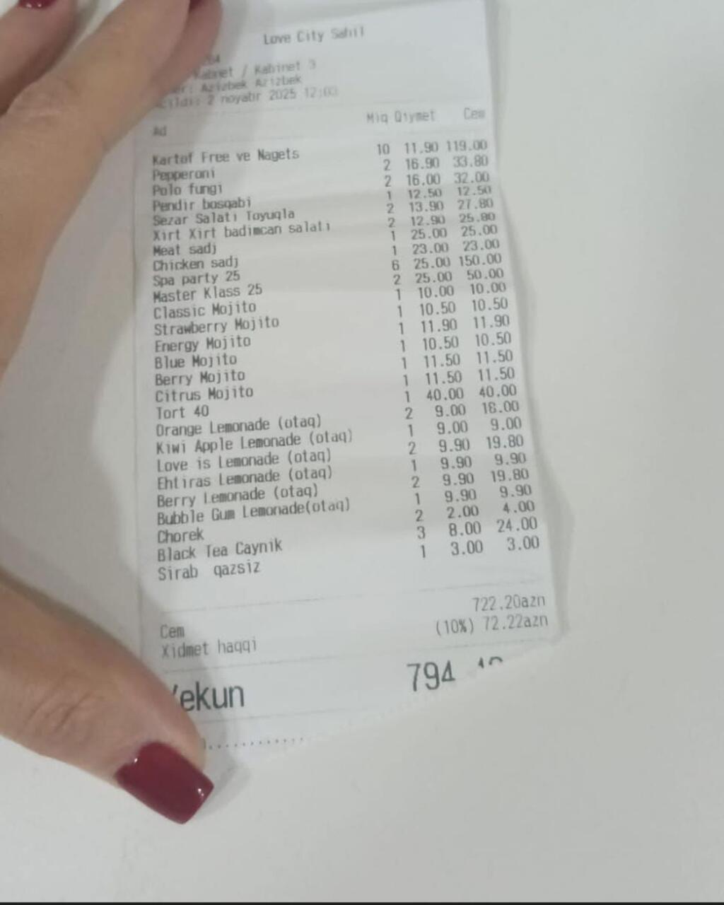 Milli.Az-ın məlumatına görə Sahil metrosunun yaxınlığında yerləşən "Love city" restoranında müştəridən 722 manatlıq hesaba görə 10 faiz servis haqqı tələb edilib.