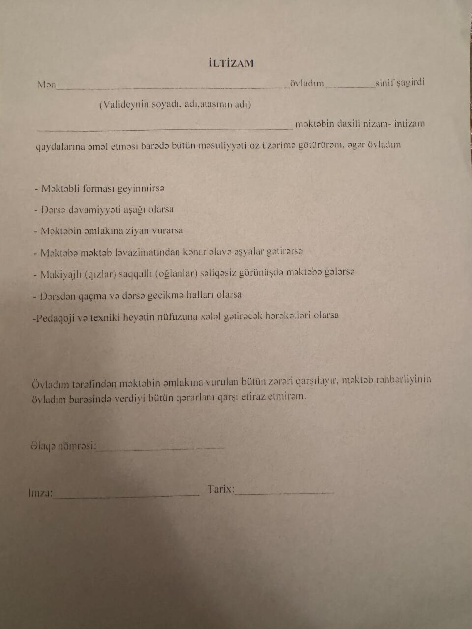 Son vaxtlar bir çox məktəblərdə valideynlərdən "İltizam" adlı sənədi imzalamaq tələb olunur.