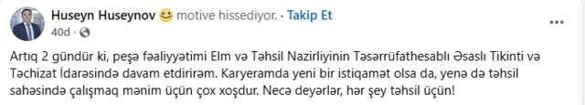 Elm və Təhsil Nazirliyinin Şirvan-Salyan Regional Təhsil İdarəsinin müdir müavini Hüseyn Hüseynov öz ərizəsi ilə işdən çıxıb.