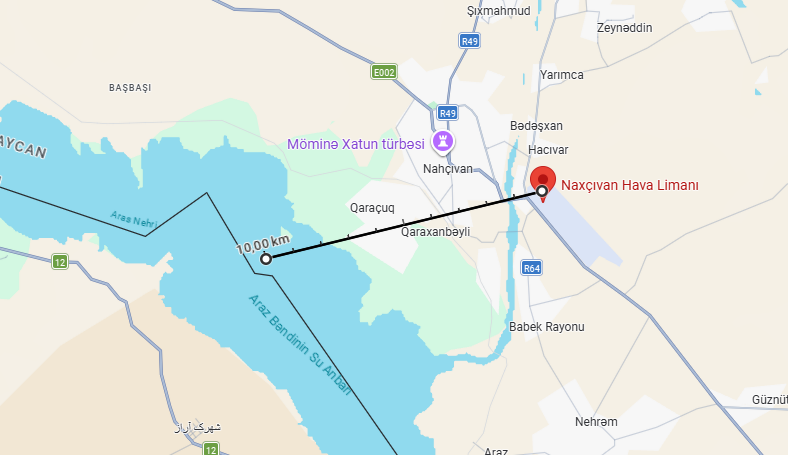 Naxçıvan hava limanından İranla sərhəddə qədər olan məsafə isə 7-8 km-dir. Yəni ARASH-2 dronuna bir neçə dəqiqə kifayətdir, həmin məsafəni qət etsin.