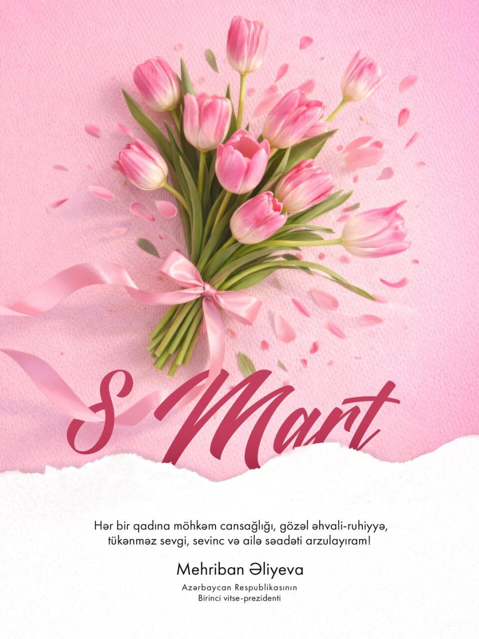 Azərbaycan Respublikasının Birinci vitse-prezidenti Mehriban Əliyeva 8 Mart - Beynəlxalq Qadınlar Günü münasibətilə rəsmi sosial şəbəkə hesabında paylaşım edib.