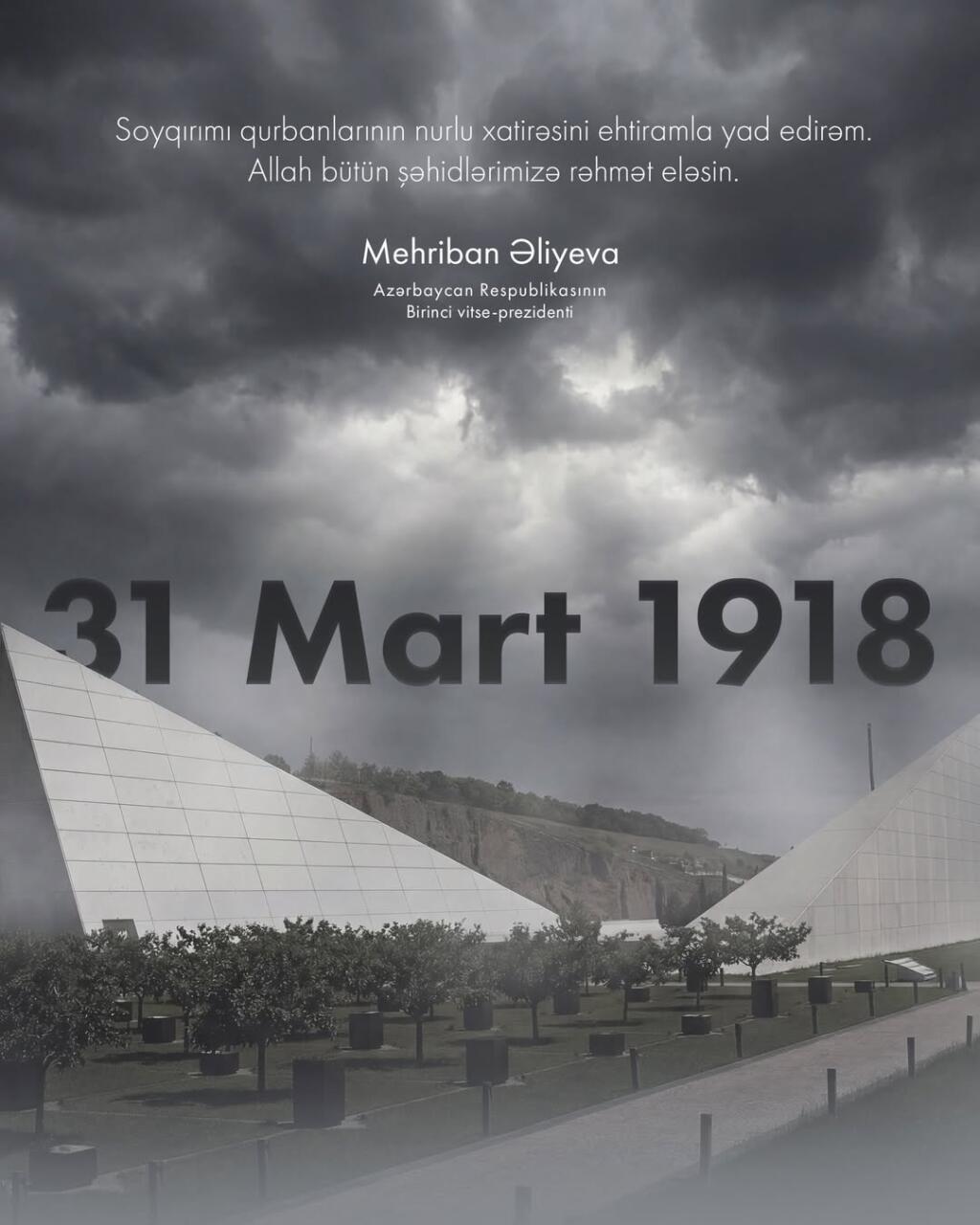 Birinci vitse-prezident Mehriban Əliyeva sosial şəbəkə hesabında 31 Mart - Azərbaycanlıların Soyqırımı Günü ilə bağlı rəsmi "Instagram" hesabında paylaşımedib.