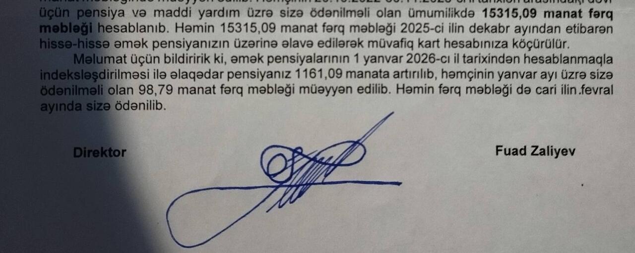 2025-ci ildə azaldılan pensiya bərpa olunub, vətəndaş 1161 manat pensiya alacaq. Eyni zamanda azaldıldığı gündən bərpa edildiyi günə olan fərq isə 15315 manat olub.