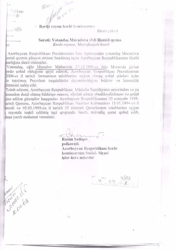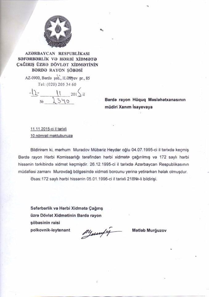 Milli.Az bildirir ki, bu barədə aznews.az-a şəhid anası Əsli Muradova məlumat verib. Onun sözlərinə görə, 1995-ci ilin iyulunda hərbi xidmətə çağırılan oğlu Mübariz Muradov həmin ilin dekabr ayında şəhid olub: "Xidmətdə olduğu aylar ərzində bir gün olsun belə hospitalda olmayıb. Murovdağda ön mövqedə xidmətə cəlb olunub. 1995-ci ilin 27 dekabrında isə əsgərlikdən cənazəsini gətiriblər. Hərbi hissənin zabit heyəti, rayon icra hakimiyyətinin səlahiyyətliləri "oğlunuz şəhiddir" deyə mənə təskinlik verirdilər. Hərbi hissənin verdiyi arayışda da oğlumun Azərbaycanın ərazi bütövlüyü uğrunda həlak olduğu göstərilib və bizə Bərdə Rayon İcra Hakimiyyətindən şəhid statusunu təsdiq edən şəhid ailəsinin vəsiqəsi verilib".