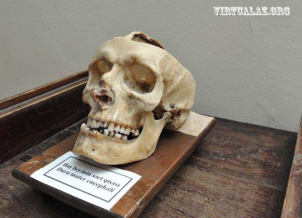 Muzeydə ən dəhşətli guşələrdən biri də insan kəlləsinin nümayiş olunduğu yer idi. Söhbət hər hansı kəllə sümüyündən getmir. Nümayiş olunan insan başı - üzərində dərisi olan, sifət cizgiləri aydın görünən eksponatlardır. Uşaqlarla bağlı eksponatlar nə qədər ürək ağrıdırsa, daha çox dəhşət filmlərini xatırladır. Elə ilk baxışdan qəza keçirdiklərini ayırd etmək olar. A.İsayevin sözlərinə görə, bura gəlib çıxana kimi meyidi əvvəlcə fiksasiya edirlər. Bunun üçün damarlara formalin məhlulu vurulur. 1 həftə, 10 gün ərzində hopur və bərkidir. Məhlul meyitdən suyu çıxarır və yerinə hopur. Bundan sonra meyidin üzərində həkimlər işləyirlər. Hansı damar, vəz lazımdırsa, onu axtarırlar.