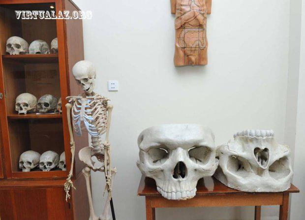 Muzeyin növbəti zalında skelet və kəllələr nümayiş olunur. Bura qədər gördüklərimdən sonra skelet və kəllələr mənə cizgi filmini xatırladır. Bu zalda təcrübə aparan tələbələrlə də tanış oluruq. Bələdçimiz deyir ki, muzeydə elmi işlə məşğul olmağa kifayət qədər kəllə var. Üzərində sarı rəngli kağız yapışdırılmış kəllələr isə tədqiq olunanlardır.