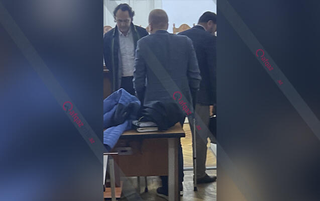 Ayaqları tutulan təqsirləndirilən şəxs vəkillərinin yardımı və əsa ilə məhkəmə zalına gəlib.