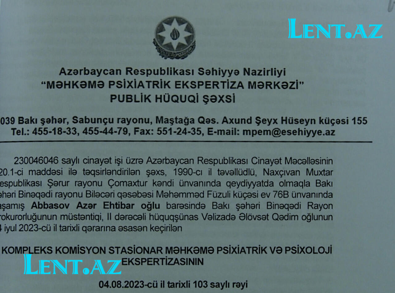 Ambulator məcburi narkoloji-tibbi yoxlamanın rəyinə əsasən, Azər Abbasovda narkotik vasitələrdən və psixotrop maddələrdən istifadə etmə halları olub. Stasionar məhkəmə-psixoloji ekspertizasının rəyindən görünüb ki, Azər Abbasov xroniki gedişli psixi patologiya olan "paranoid şizofreniya" xəstəliyindən əziyyət çəkir. Buna görə də onun əməli Cinayət Məcəlləsinin 21-ci (anlaqsızlıq) maddəsinin təsiri altına düşüb. Abbasov öz hərəkətlərinin faktiki xarakterini və ictimai təhlükəliliyini dərk və onları idarə etmək iqtidarında deyil.