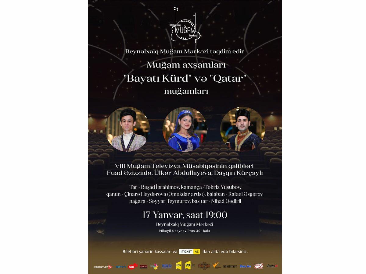 Yanvarın 17-də Beynəlxalq Muğam Mərkəzinin "Muğam axşamları" layihəsinin konserti keçirilib. Musiqi gecəsində "Bayatı Kürd" və "Qatar" muğamları VIII "Muğam" Televiziya Müsabiqəsinin qalibləri Fuad Əzizzadə, Ülkər Abdullayeva və Daşqın Kürçaylı tərəfindən ifa olunub. Gənc xanəndələrin uğurlu çıxışları tamaşaçıların alqışları ilə qarşılanıb. Muğam sənətimizə olan sevgi və maraq, musiqisevərlərin gənc xanəndələrə dəstəyi ifaçıların yüksək ruhla çıxışlarında ifadə edilib. Azərbaycan xalqı üçün muğam həm musiqi, həm fəlsəfə, həm insanın ruhunu oxşayan özünəməxsus meditasiyadır. Bu tükənməz səltənətdən həmin gecə gənc xanəndələrin payına düşən gövhəri müsabiqə qalibləri incəliklə, məsuliyyətlə təqdim etməyə çalışıblar. Xanəndələrin uğurlu çıxışları tamaşaçılarda dərin təəssüratlar yaradıb.