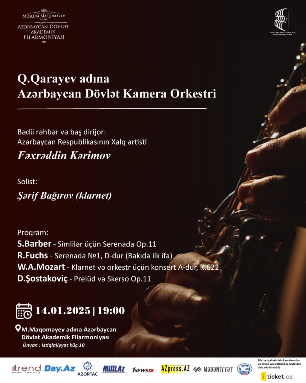 Bədii rəhbər və baş dirijor Azərbaycan Respublikasının Xalq artisti Fəxrəddin Kərimovun rəhbərliyi, Q.Qarayev adına Azərbaycan Dövlət Kamera Orkestrinin müşayiəti ilə solist - Respublika və beynəlxalq müsabiqələr laureatı Şərif Bağırov (klarnet) dinləyicilər qarşısında çıxış edib.