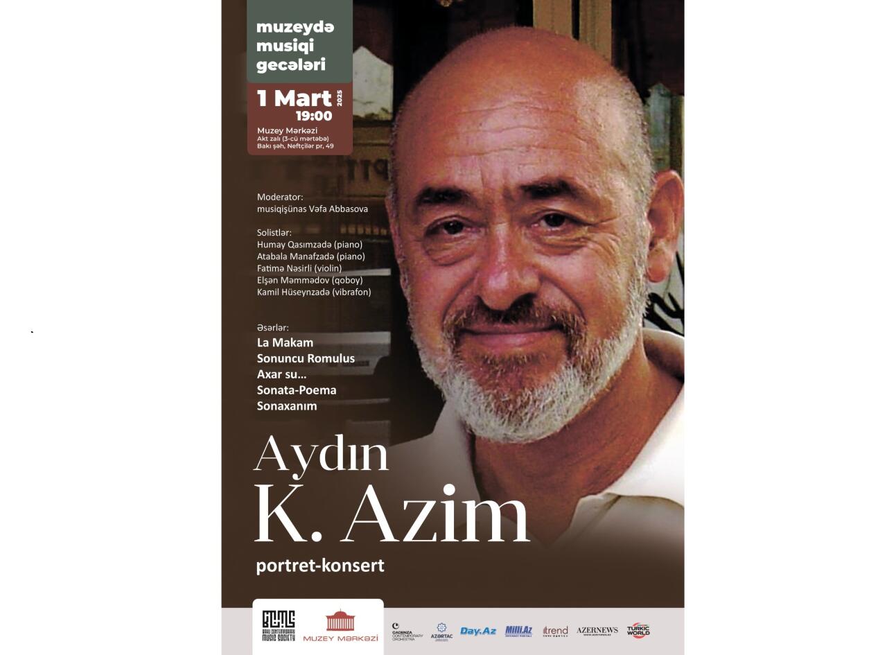 Bakı Müasir Musiqi Cəmiyyəti və Muzey Mərkəzinin birgə layihəsi olan "Muzeydə musiqi gecələri" növbəti portret-konserti təqdim edir. 1 mart saat 19:00-da Muzey Mərkəzində keçiriləcək portret-konsertdə bəstəkar, professor Aydın K. Azimin yaradıcılığı işıqlandırılacaq. Musiqişünas Vəfa Abbasovanın moderatorluğu ilə təqdim olunacaq portret-konsertdə bəstəkarın "La Makam", "Sonuncu Romulus", "Axar su", "Sonata-poema" və "Sonaxanım" əsərləri ifa olunacaq. Konsertin solistləri Humay Qasımzadə (piano), Atabala Manafzadə (piano), Fatimə Nəsirli (violin), Elşən Məmmədov (qoboy) və Kamil Hüseynzadədir (vibrafon).