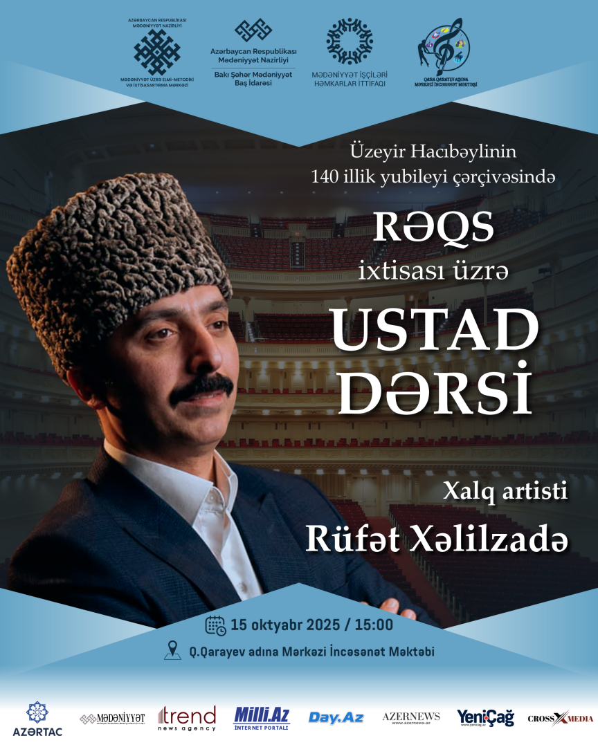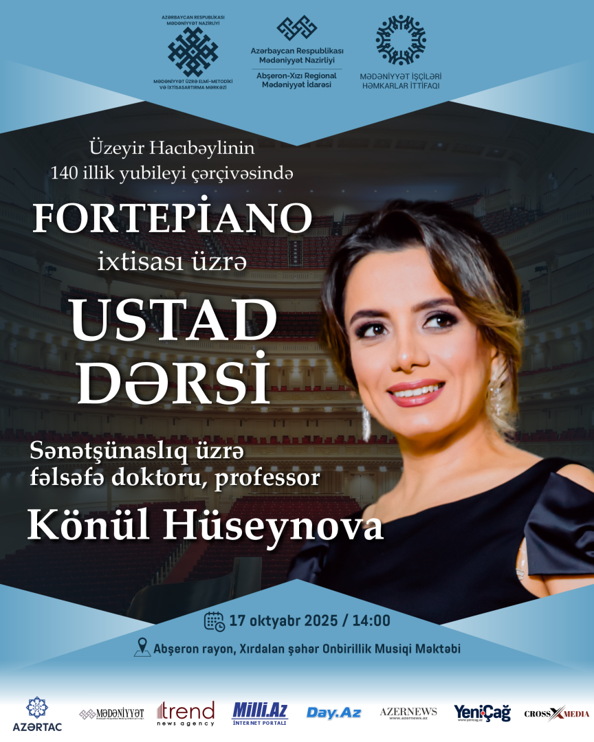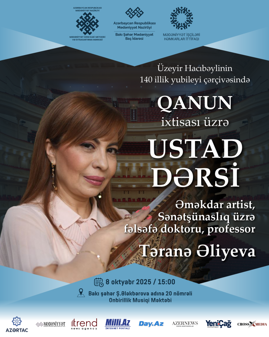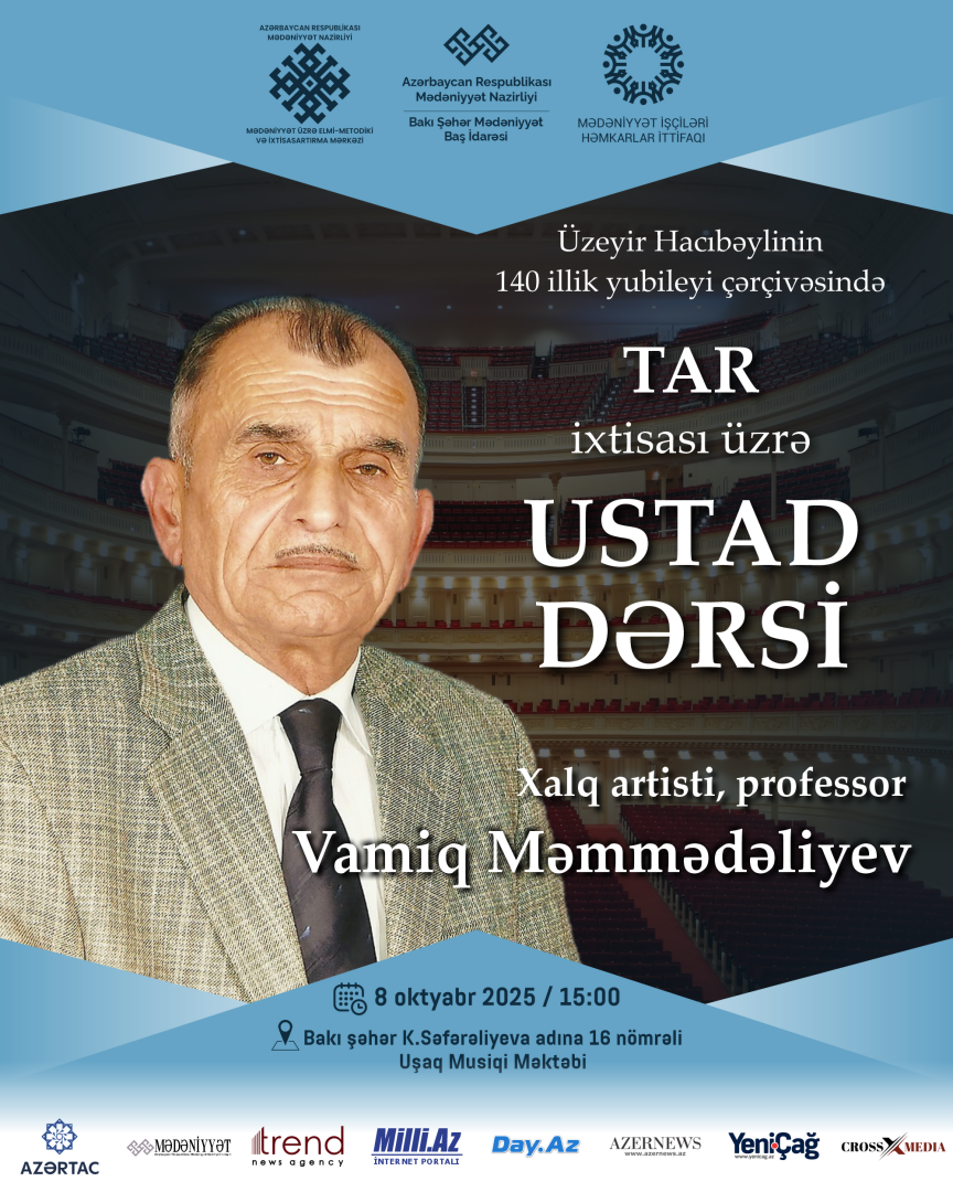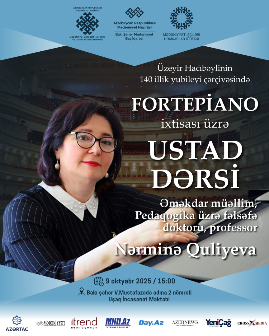 Mədəniyyət Nazirliyinin Mədəniyyət üzrə Elmi-Metodiki və İxtisasartırma Mərkəzinin təşkilatçılığı, Azərbaycan Həmkarlar İttifaqları Konfederasiyasının üzv təşkilatı - Mədəniyyət İşçiləri Həmkarlar İttifaqı, Bakı Şəhər Mədəniyyət Baş İdarəsi və Abşeron-Xızı Regional Mədəniyyət İdarəsinin dəstəyi ilə 8-18 oktyabr tarixlərində bu idarələrin tabeliyində fəaliyyət göstərən musiqi və incəsənət məktəblərinin müəllim və şagirdləri üçün ustad dərsləri keçiriləcək.