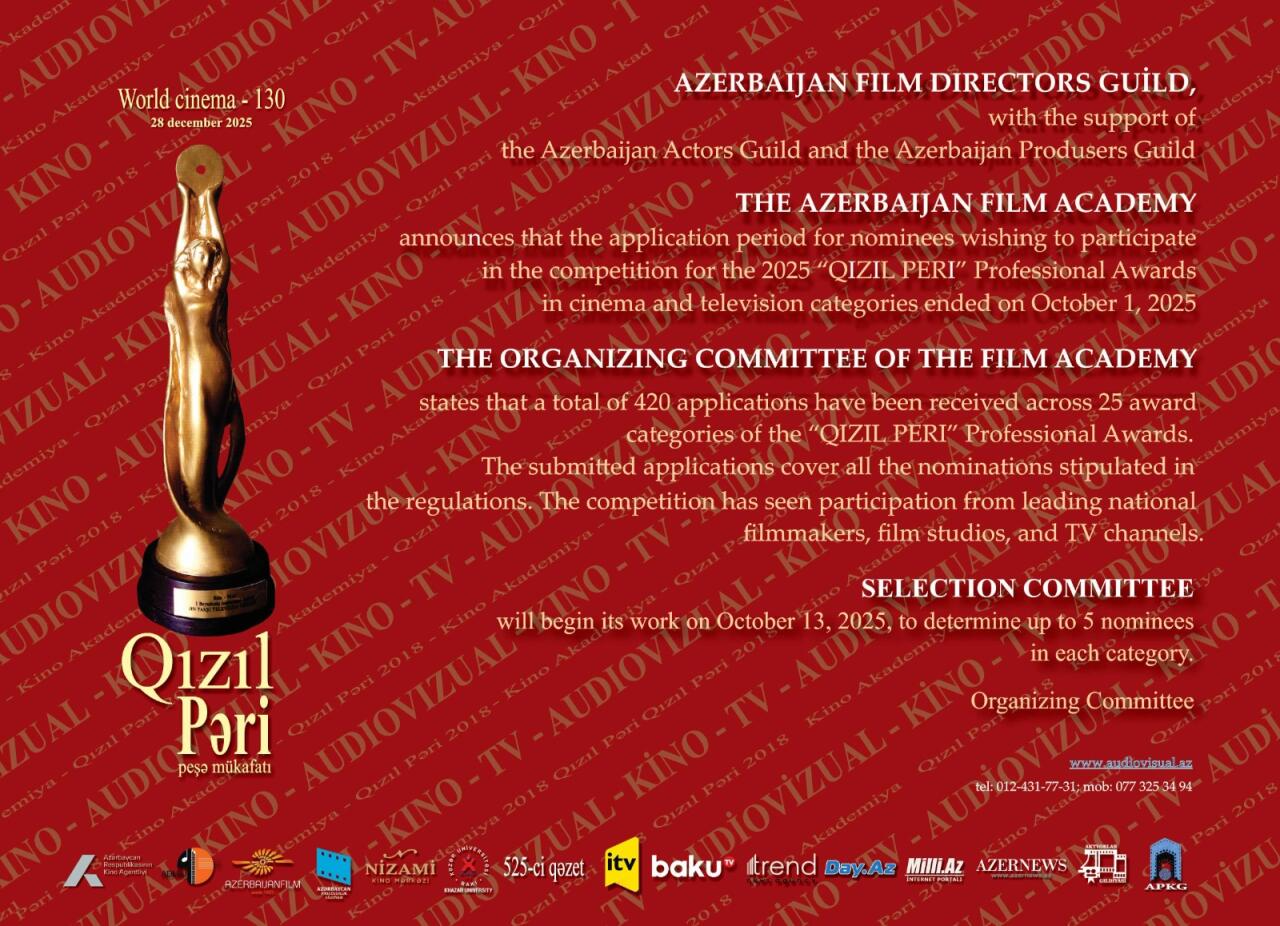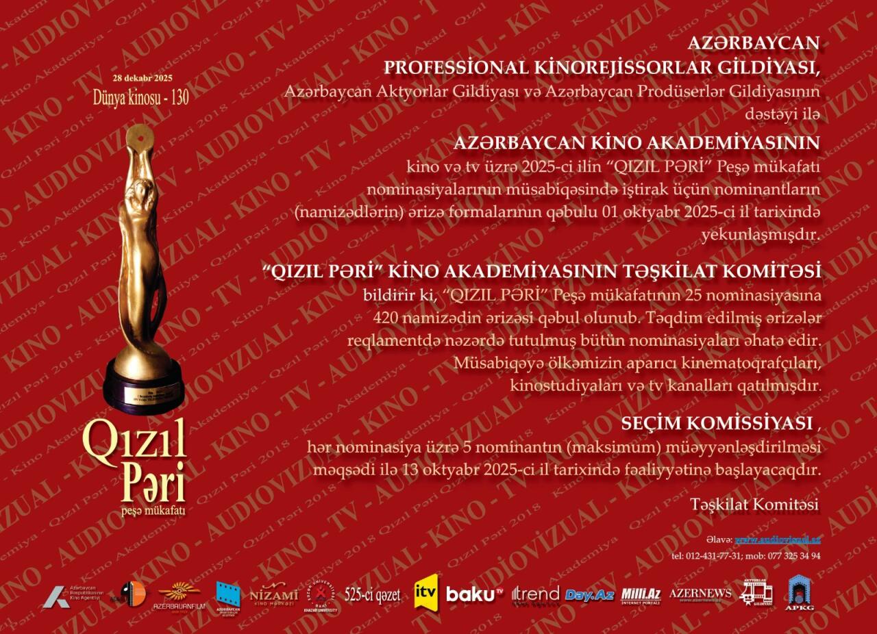 Azərbaycan Professional Kinorejissorlar Gildiyasının, Azərbaycan Aktyorlar Gildiyasının və Azərbaycan Prodüserlər Gildiyasının dəstəyi ilə fəaliyyət göstərən Azərbaycan Kino Akademiyası tərəfindən təsis edilən "Qızıl Pəri" Peşə Mükafatı üzrə 2025-ci il üçün nominasiyalara müraciət qəbulu yekunlaşıb.