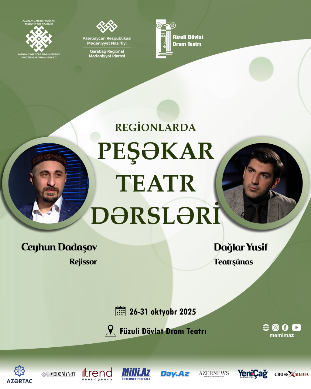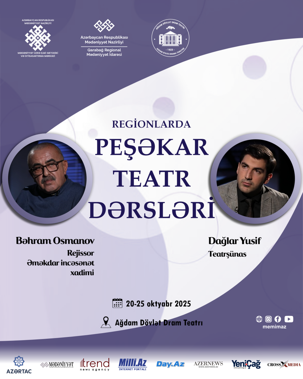 20-25 oktyabr tarixlərində Ağdam Dövlət Dram Teatrında, 26-31 oktyabr tarixlərində isə Füzuli Dövlət Dram Teatrında "Regionlarda peşəkar teatr dərsləri" adlı silsilə tədbirlər keçiriləcək.
