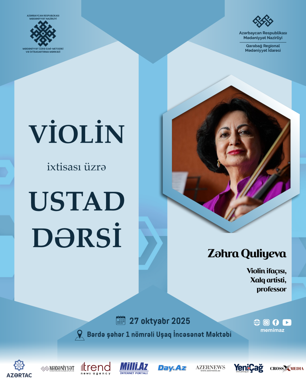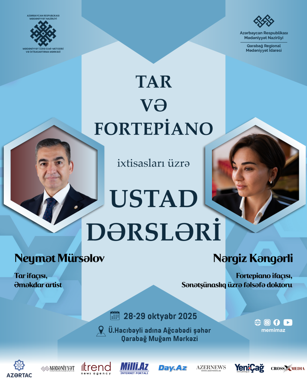 "Mədəniyyət rüzgarı" çərçivəsində silsilə ustad dərsləri də nəzərdə tutulur. Oktyabrın 27-də Bərdə şəhər 1 nömrəli uşaq incəsənət məktəbində Xalq artisti, professor Zəhra Quliyevanın iştirakı ilə violin, oktyabrın 28-də isə Üzeyir Hacıbəyli adına Ağcabədi şəhər Qarabağ Muğam Mərkəzində Əməkdar artist Neymət Mürsəlovun iştirakı ilə tar, sənətşünaslıq üzrə fəlsəfə doktoru Nərgiz Kəngərli tərəfindən fortepiano ixtisası üzrə ustad dərsləri keçiriləcək.