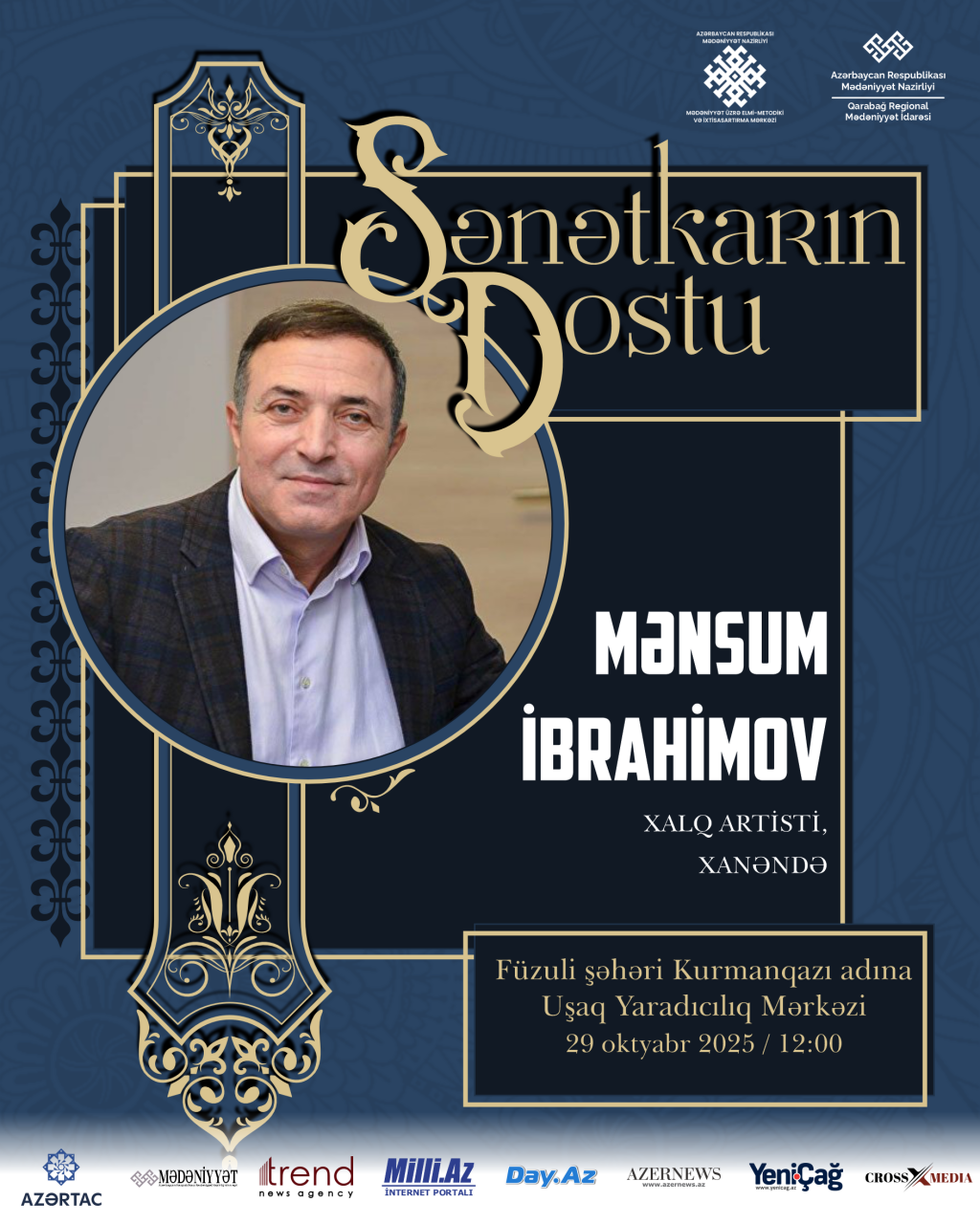 "Sənətkarın dostu" layihəsi çərçivəsində növbəti görüş 29 oktyabr tarixində Füzuli şəhərindəki Kurmanqazı adına Uşaq Yaradıcılıq Mərkəzində Xalq artisti, xanəndə, pedaqoq Mənsum İbrahimovun iştirakı ilə reallaşacaq.