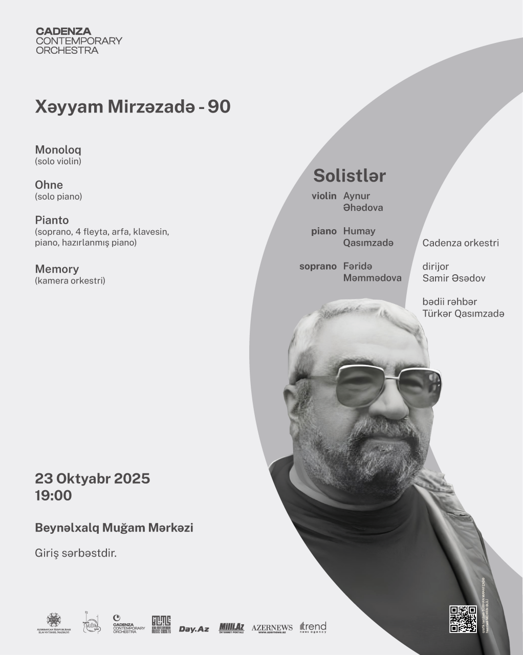 Cadenza orkestri 23 oktyabr saat 19:00-da Beynəlxalq Muğam Mərkəzində görkəmli Azərbaycan bəstəkarı Xəyyam Mirzəzadənin 90 illiyinə həsr olunmuş növbəti konsertini keçirəcək. Bakı Müasir Musiqi Cəmiyyətinin təşkilatçılığı ilə baş tutacaq "Xəyyam Mirzəzadə-90" adlı konsertdə bəstəkarın müxtəlif illərdə yazdığı "Monoloq", "Ohne", "Pianto" və "Memory" əsərləri ifa olunacaq. Konsertin solistləri Aynur Əhədova (violin), Humay Qasımzadə (piano) və Fəridə Məmmədova (soprano) olacaq.