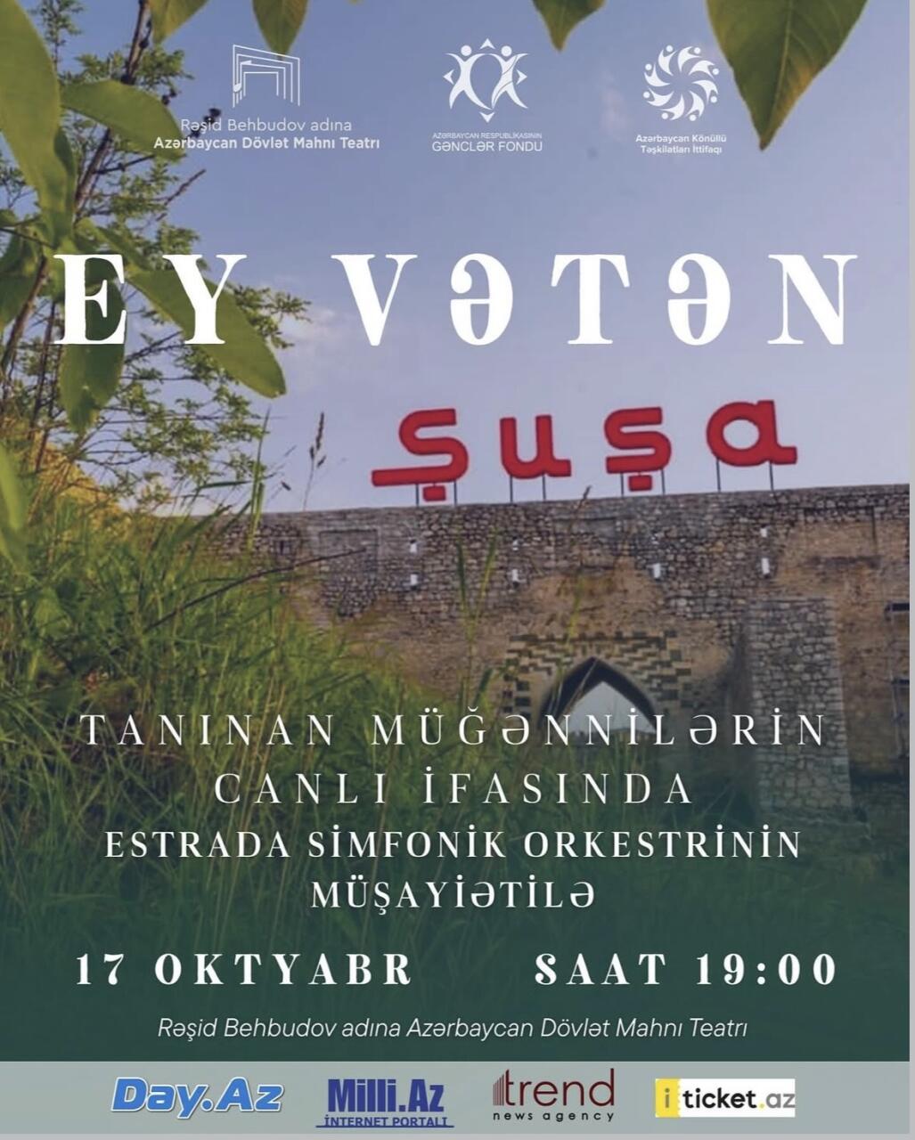 Rəşid Behbudov adına Azərbaycan Dövlət Mahnı Teatrında 18 oktyabr - Müstəqilliyin Bərpası Gününə həsr olunmuş "Ey Vətən" adlı möhtəşəm musiqi axşamı keçirilib. Tədbir Dövlət Mahnı Teatrının təşkilatçılığı, Azərbaycan Respublikasının Gənclər Fondunun və Azərbaycan Könüllü Təşkilatları İttifaqının tərəfdaşlığı ilə baş tutub.