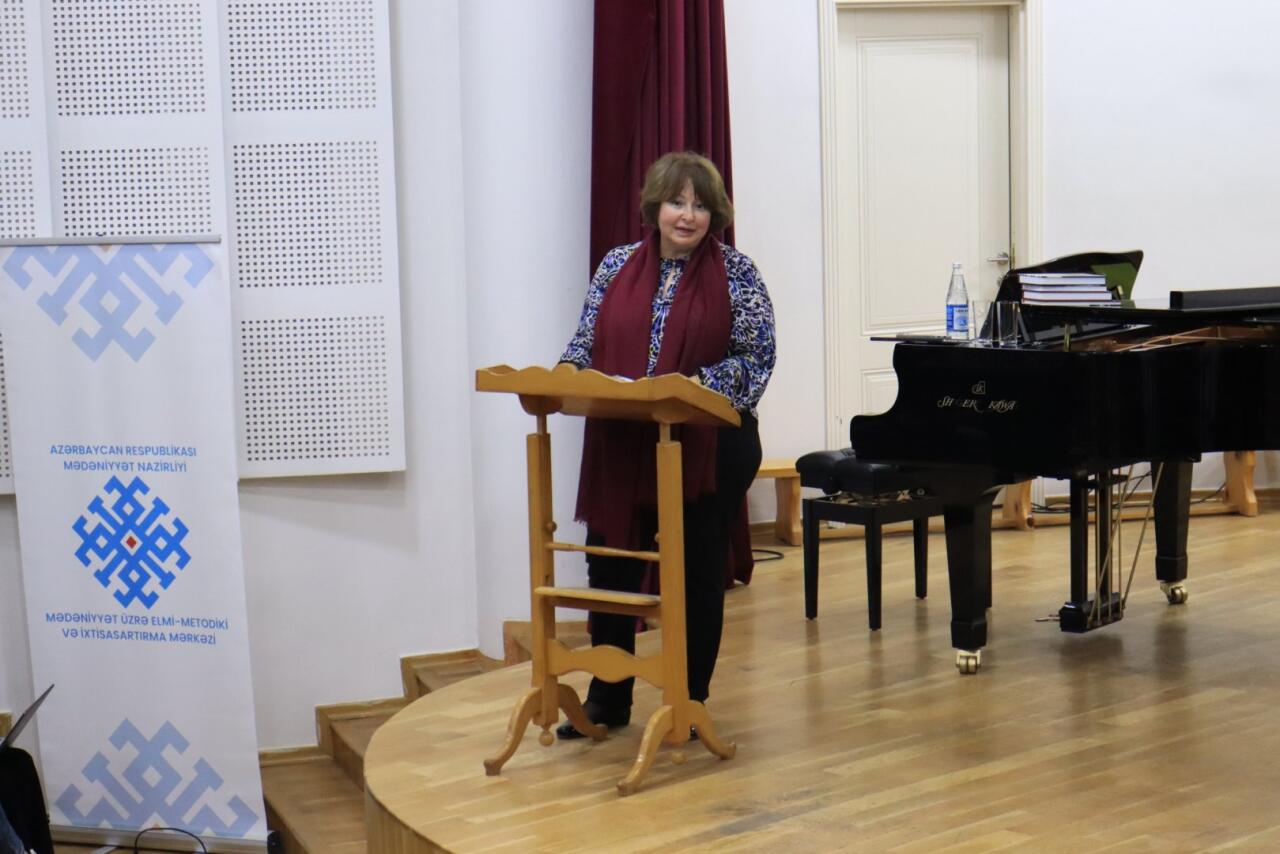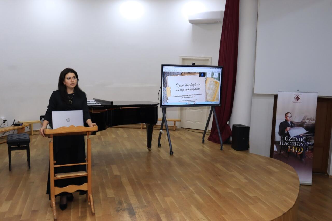Sənətşünaslıq üzrə fəlsəfə doktoru, Qarabağ Universiteti İncəsənət fakültəsinin baş müəllimi Aybəniz Növrəsli "Üzeyir Hacıbəyli və musiqi pedaqogikası" mövzusunda çıxış edərək musiqi təhsili sahəsində mövcud müxtəlif sistemlərdən söz açıb, onlardan bəhrələnməyin zəruriliyi məsələsinə toxunub.