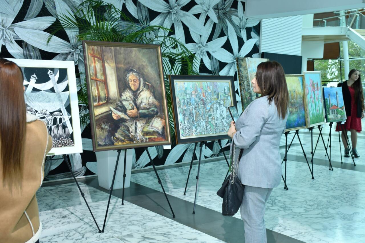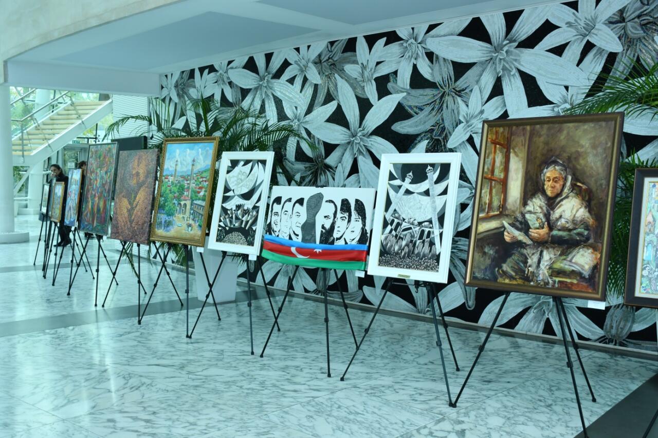 Qonaqlar əvvəlcə Dövlət Rəsm Qalereyası tərəfindən Muğam Mərkəzinin foyesində Zəfərimizin 5-ci ildönümü münasibətilə təşkil edilən rəsm sərgisi ilə tanış olublar.