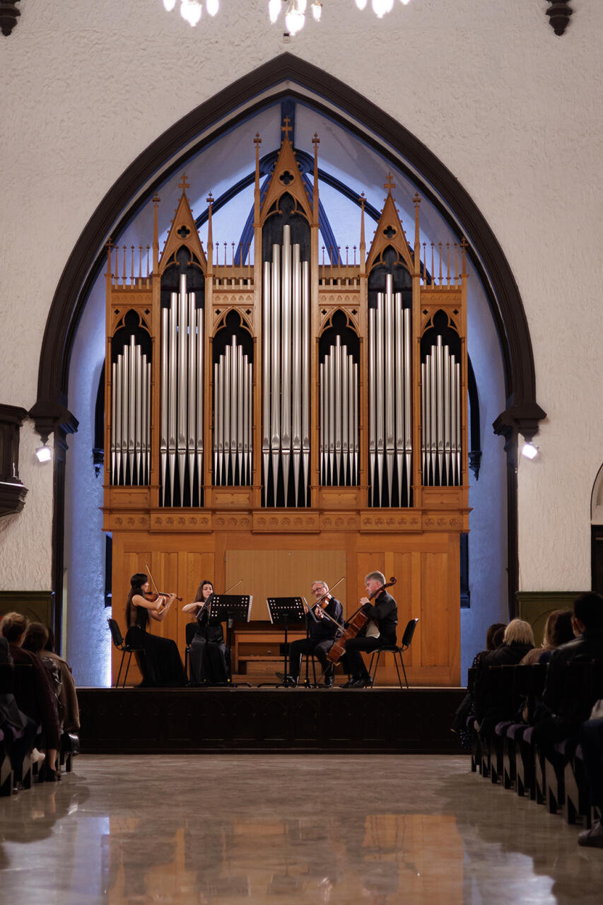 Zərif musiqi atmosferində baş tutan bu axşamda Azərbaycan Dövlət Simli Kvarteti dinləyicilərə yüksək səviyyəli ifa mədəniyyəti və dərin bədii zövq bəxş edib. Konsert proqramında klassik musiqi irsinin iki möhtəşəm nümunəsi - L.v.Beethoven'in 4 saylı simli kvarteti (c-moll, op.18) və C.Franck'ın D-dur simli kvarteti səslənib.
