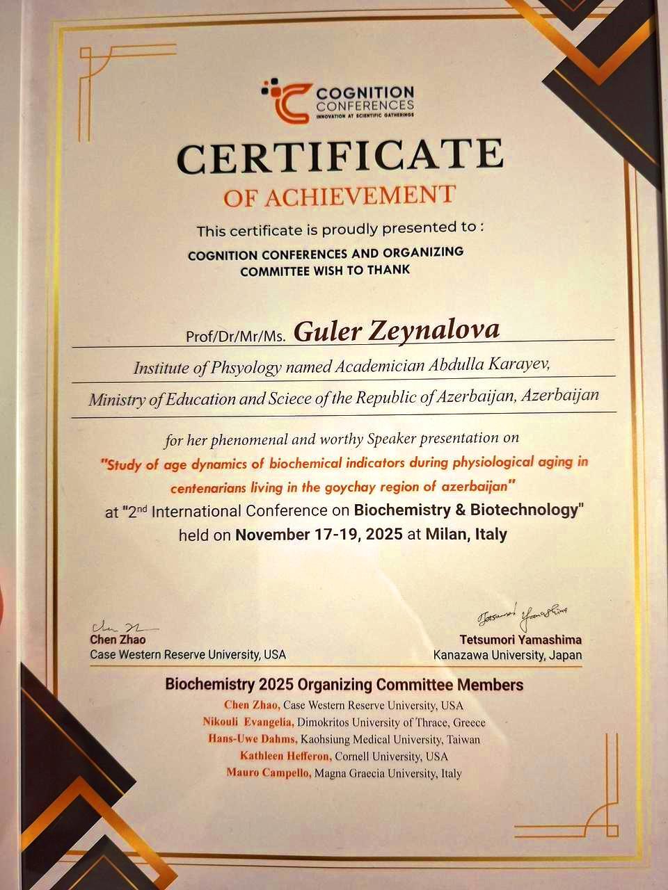 Konfrans çərçivəsində Gülər Zeynalova "Age dynamics of biochemical indicators during physiological aging in centenarians living in Goychay region of Azerbaijan" ("Azərbaycanın Göyçay rayonunda yaşayan uzunömürlülərdə fizioloji yaşlanma zamanı biokimyəvi parametrlərin yaş dinamikası") mövzusunda spiker qismində məruzə təqdim edib.