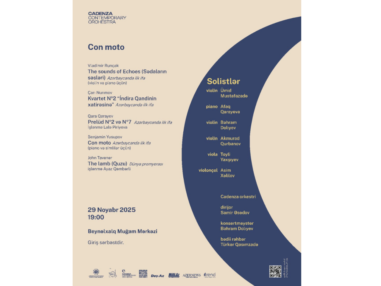 Bakı Müasir Musiqi Cəmiyyəti Cadenza orkestrinin iştirakı ilə 29 noyabr saat 19:00-da Beyəlxalq Muğam Mərkəzində "Con moto" adlı növbəti konsertini keçirəcək. Konsertdə Vladimir Runçakın "Sədaların səsləri", Çarı Nurımovun "İndira Qandinin xatirəsinə" adlı kvarteti, Qara Qarayevin Prelüd №2 və №7 (işlənmə Lalə Piriyeva), Benjamin Yusupovun "Con moto" və John Tavenerin "Quzu" (işlənmə Ayaz Qəmbərli) əsərləri ifa ediləcək. Qeyd edək ki, əsərlər Azərbaycanda ilk dəfə ifa olunur.
