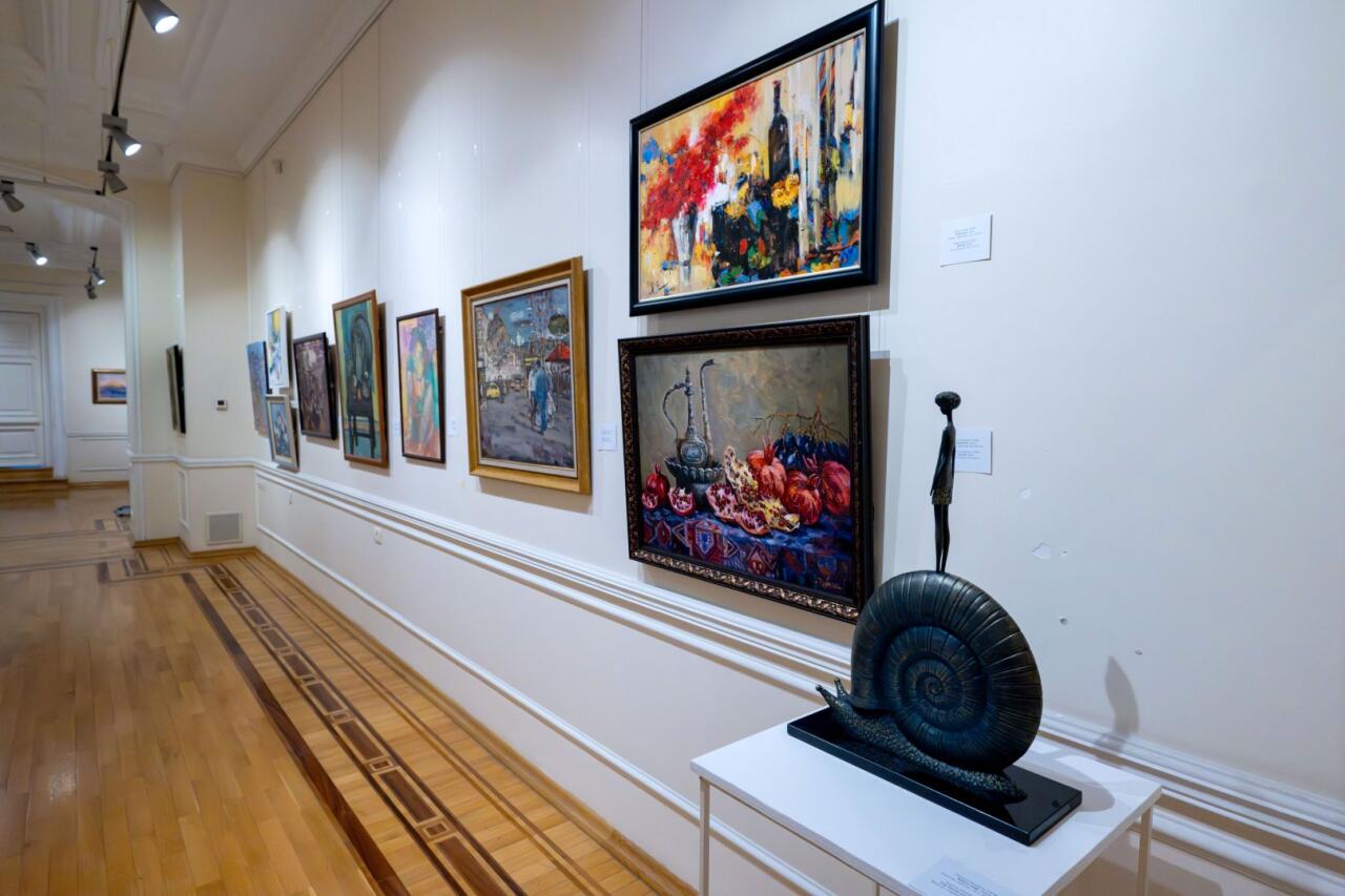 Akademiyanın professor-müəllim heyətinin yaradıcılığını əks etdirən ekspozisiya rəngkarlıq, heykəltəraşlıq, qrafika və dekorativ tətbiqi sənət nümunələrini əhatə edir. Burada Azərbaycan təsviri sənətinin tanınmış nümayəndələri - N.Əliyev, F.Salayev, S. Məmmədov, S.Mirzəzadə, E.Mikayılzadə, C.Hüseynov, M.Hüseynov, N.Əhmədova və digər müəlliflərin əsərləri ilə yanaşı, akademiyanın yaradıcı mühitində formalaşan B.Yusifov, R.Məmmədov, R.Qarayev, N.Məmmədov, C.Ağayev və başqa istedadlı gənc rəssamların bədii axtarışlarını əks etdirən işlər də nümayiş olunur.