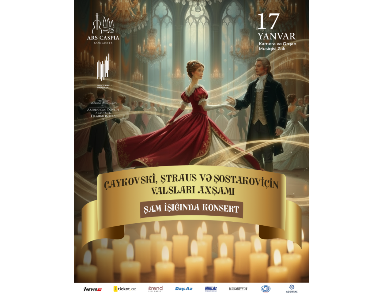 17 yanvar saat 18:30 və 20:30-da Bakının heyrətamiz gözəlliyə malik tarixi Kamera və Orqan Musiqisi Zalında şam işığında unikal bir konsert - J. Strauss, P. Çaykovski, D. Şostakoviçin əfsanəvi valsları ibarət axşam keçiriləcək.