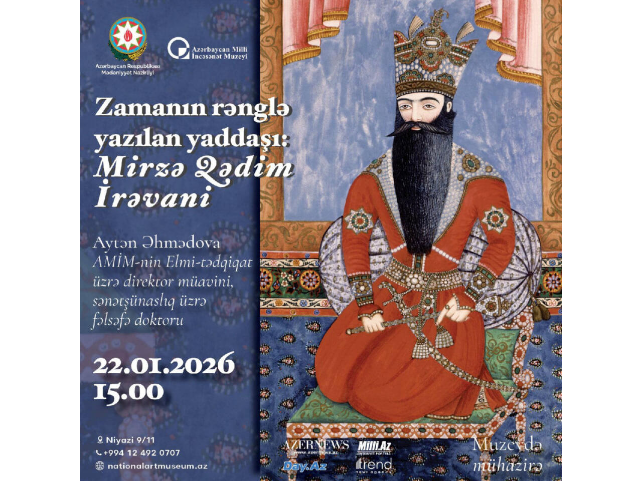 22 yanvar 2026-cı il tarixində saat 15:00-da Azərbaycan Milli İncəsənət Muzeyində "Muzeydə mühazirə layihəsi çərçivəsində "Zamanın rənglə yazılan yaddaşı: Mirzə Qədim İrəvani" adlı mühazirə keçiriləcək.