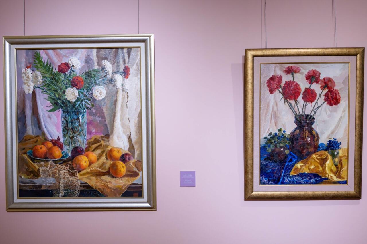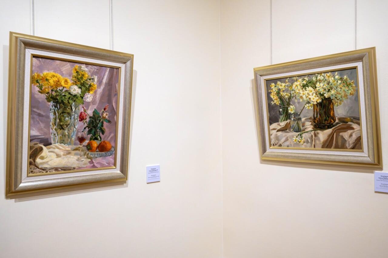 Ekspozisiyada müəllifin natürmort, portret və tematik tabloları xüsusi yer tutur. İlk zalda nümayiş olunan "Nərgizlər", "Xrizantemlər", "Astralar" kimi çiçək natürmortları rəssamın zərif kolorit duyumunu və rəng harmoniyasına həssas yanaşmasını parlaq şəkildə əks etdirir. Bu əsərlərdə gül ləçəklərinin incə fakturası və işıq-kölgə keçidləri poetik ovqat yaradır və tamaşaçını estetik bir aləmə aparır.