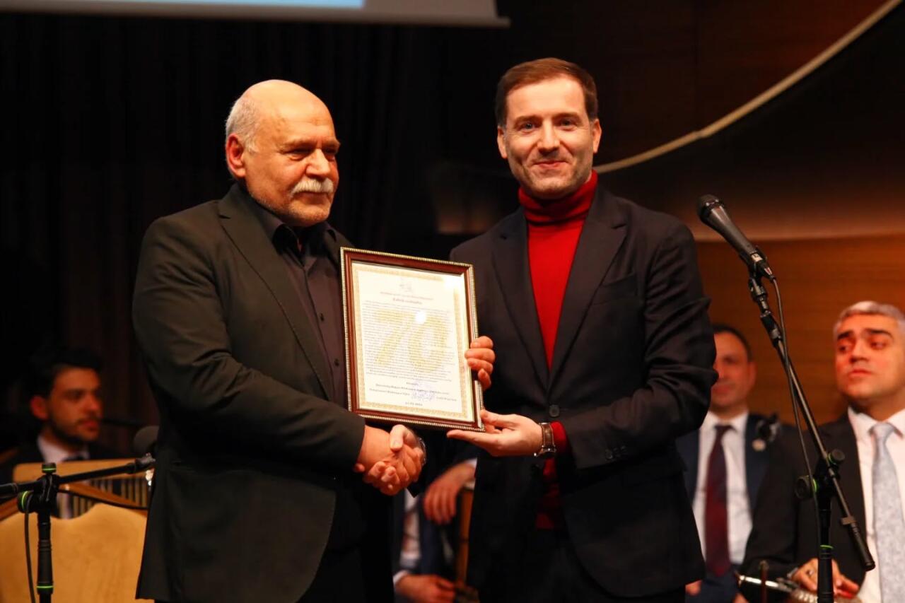Tədbirdə Beynəlxalq Muğam Mərkəzinin direktoru, Əməkdar artist, Özbəkistanın mədəniyyət səfiri Sahib Paşazadə sənətkarın oğlu və layiqli davamçısı Əməkdar artist Elxan Mansurovu 70 illik yubileyi münasibətilə təbrik edərək , mərkəzin adından təbrik məktubunu ünvanlayıb.