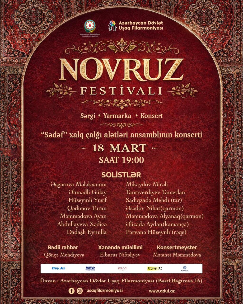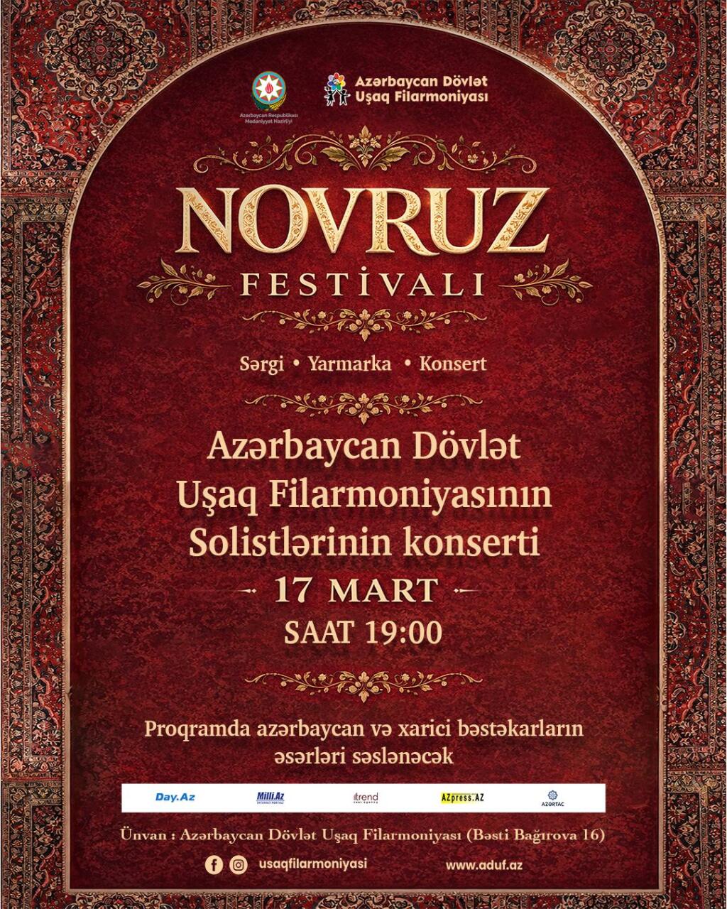 Azərbaycan Dövlət Uşaq Filarmoniyasında Novruz bayramı münasibətilə "Novruz Festivalı" keçiriləcək. Festival çərçivəsində tamaşaçılar üçün müxtəlif konsert proqramları, eləcə də sərgi və yarmarka təşkil olunacaq.