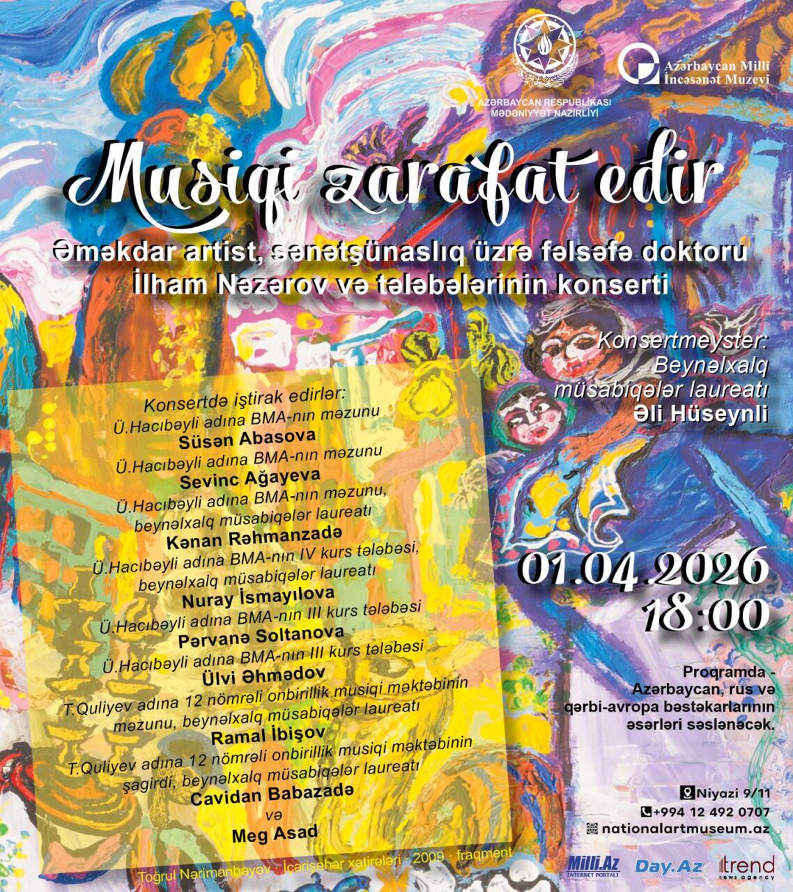 Aprelin 1-də Azərbaycan Milli İncəsənət Muzeyində "Musiqi zarafat edir" adlı konsert proqramı keçirilib . Musiqili axşamda Əməkdar artist, sənətşünaslıq üzrə fəlsəfə doktoru İlham Nəzərov və onun tələbələri - Üzeyir Hacıbəyli adına Bakı Musiqi Akademiyasının məzunları Süsən Abasova və Sevinc Ağayeva, beynəlxalq müsabiqələr laureatı Kənan Rəhmanzadə, akademiyanın IV kurs tələbəsi, beynəlxalq müsabiqələr laureatı Nuray İsmayılova, III kurs tələbələri Pərvanə Soltanova və Ülvi Əhmədov, Ramal Qəhrəmanlı, Tofiq Quliyev adına 12 nömrəli onbirillik musiqi məktəbinin məzunu, beynəlxalq müsabiqələr laureatı Ramal İbişov, həmin məktəbin şagirdi, beynəlxalq müsabiqələr laureatı Cavidan Babazadə və Xalq artisti, professor Xuraman Qasımovanın tələbəsi Səməd Novruzov çıxış ediblər.