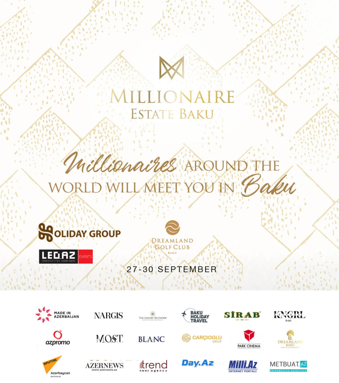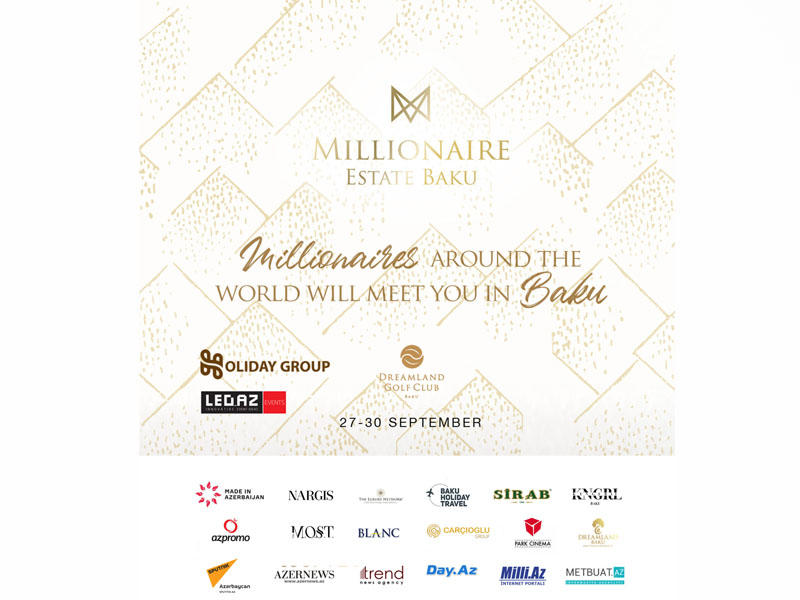 Sentyabrın 27-dən 30-dək Dreamland Baku-da "Holiday Group" və "Led.Az Events" şirkətinin birgə təşkilatçılığı ilə paytaxtımızda ilk dəfə keçiriləcək möhtəşəm "Millionaire Estate Baku"nun qala gecəsinə dünyanın hər tərəfindən məşhur influenser və bloqerlər, eyni zamanda ölkənin tanınmış simaları qatılacaq.