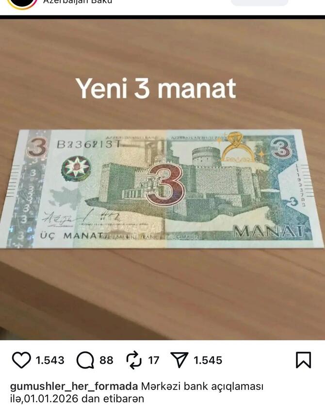 "Son dövrlər müxtəlif sosial şəbəkələrdə yeni 3 manat nominallı kağız pul nişanının tədavülə buraxılacağı ilə bağlı xəbərlər paylaşılmışdır. Bildiririk ki, yayılan xəbərlər həqiqəti əks etdirmir və vətəndaşları bu kimi məsələlərdə dəqiq məlumatları yalnız Azərbaycan Respublikası Mərkəzi Bankının rəsmi internet səhifəsi və ya rəsmi sosial şəbəkə hesablarından əldə etməyə çağırırıq".