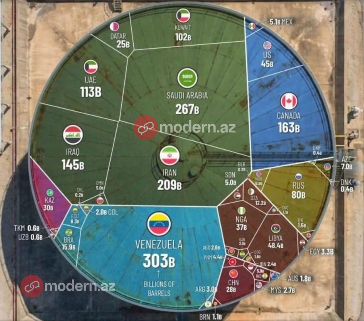 Milli.Az modern.az-a istinadən dünyada neft ehtiyatına görə, lider ölkəlırin siyahısını təqdim edir: