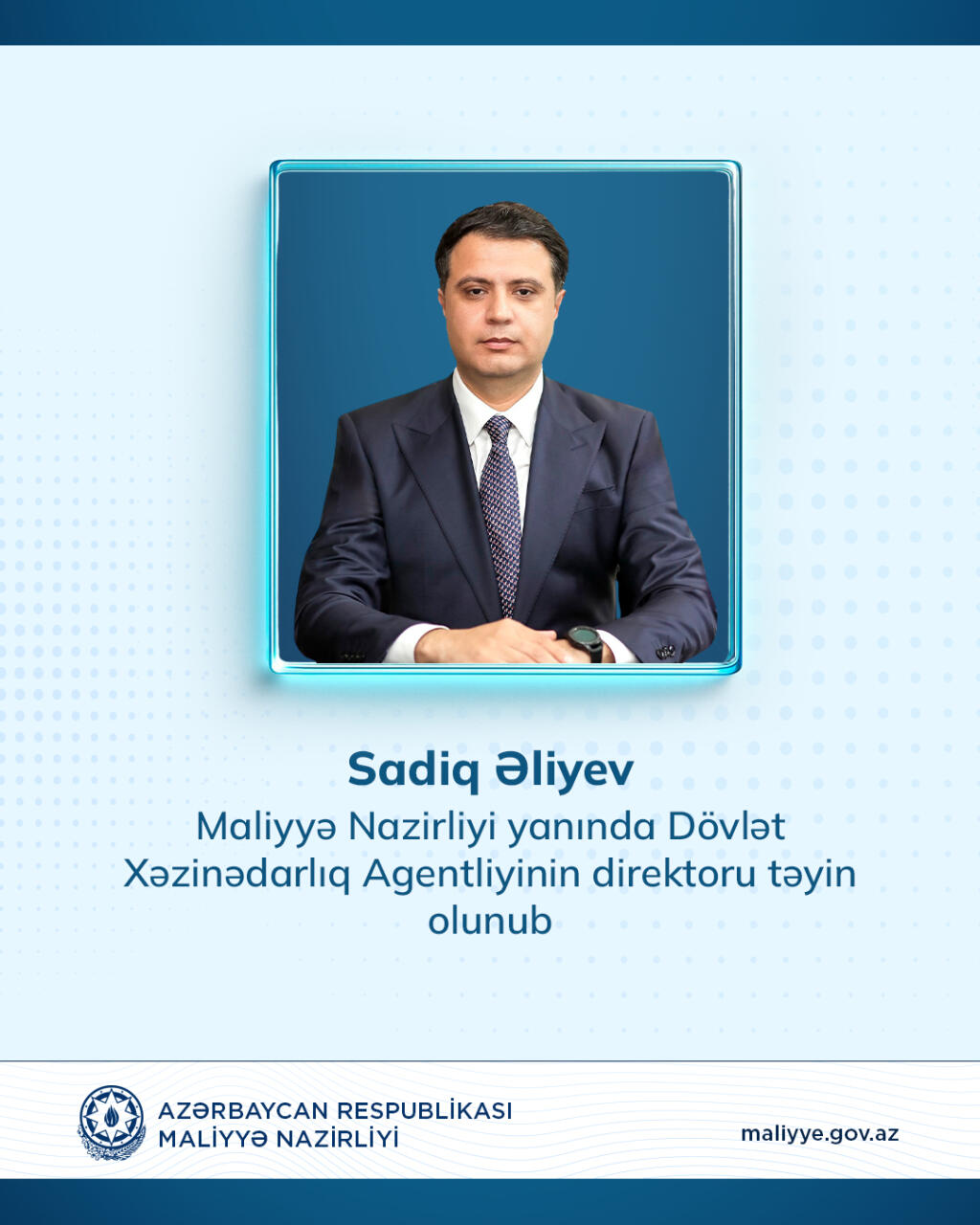 Milli.Az nazirliyə istinadən xəbər verir ki, Sadiq Cabir oğlu Əliyev Azərbaycan Respublikası Maliyyə Nazirliyi yanında Dövlət Xəzinədarlıq Agentliyinin direktoru təyin olunub.