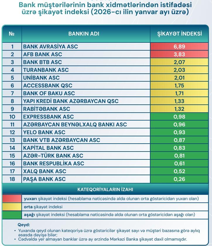 2026-cı ilin yanvar ayında Azərbaycanda bank sektorunda müştəri narazılıqları ilə bağlı statistik göstəricilər diqqət çəkən mənzərə ortaya qoyub. Hesabatlara əsasən, ən çox şikayət edilən banklar sırasında "Bank Avrasiya" və "AFB Bank" ilk yerlərdə qərarlaşıb.