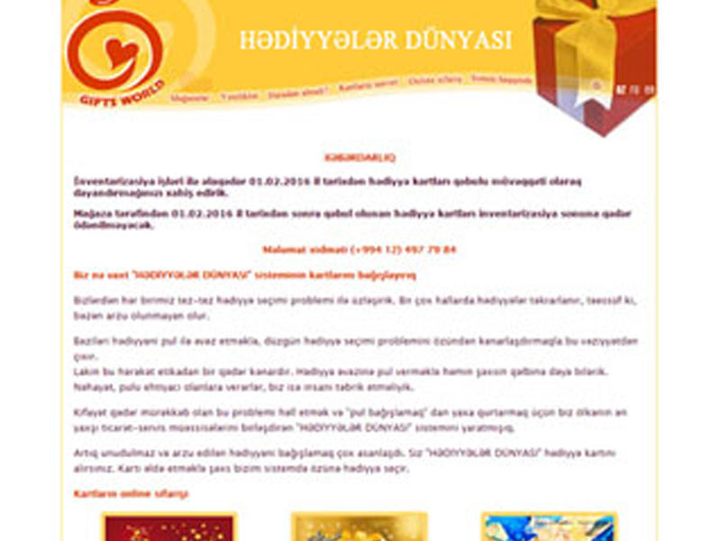 Biz də bu problemlə bağlı kiçik bir araşdırma aparmaq qərarına gəldik. Şirkətə məxsus gifts.az saytında yazılıb ki, inventarizasiya işləri ilə əlaqədar 01.02.2016 il tarixdən hədiyyə kartlarının qəbulunu müvəqqəti olaraq dayandırmağınızı xahiş edirik. Mağaza tərəfindən 01.02.2016 il tarixdən sonra qəbul olunan hədiyyə kartları inventarizasiya bitənə qədər ödənilməyəcək. Şirkətlə əlaqə saxladığımızda isə, aldığımız yeganə cavab bu oldu: "Aprel ayından bütün kartlar bərpa olunacaq".