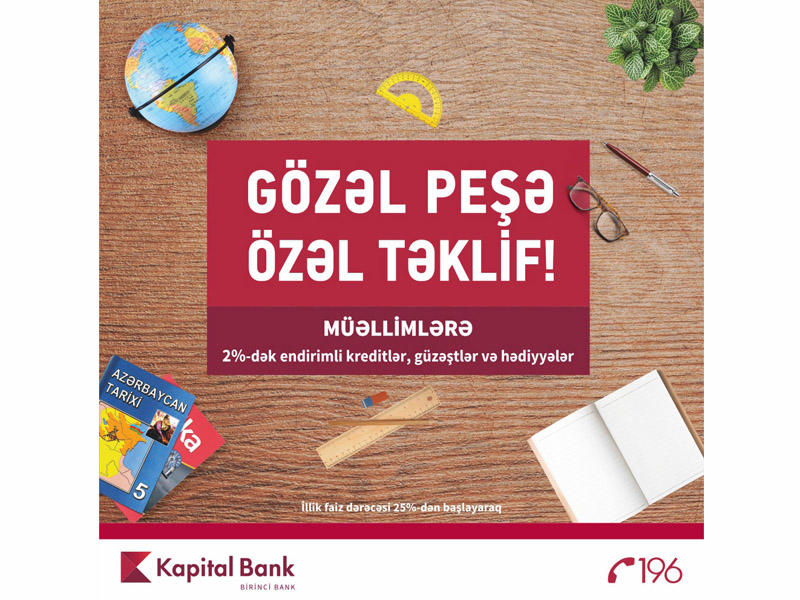 Kapital Bank 1 dekabr 2017-ci il tarixədək təhsil işçilərinə "Gözəl peşə, özəl təklif" adlı güzəştli kredit kampaniyası təqdim edir. Aksiya çərçivəsində Kapital Bank-a müraciət edən təhsil işçilərinə illik faiz dərəcəsində 2%-dək endirim edilir. Həmçinin bəzi hallarda kredit komissiyasız və 8 000 AZN-dək zaminsiz veriləcək.