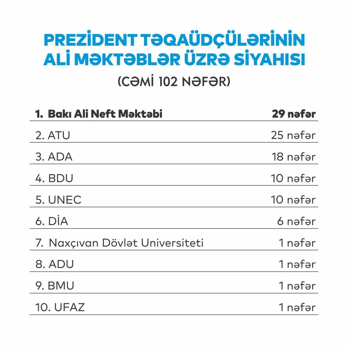 "Qafqazinfo" "Azərbaycan Universitetləri" səhifəsinə istinadən aşağıdakı cədvəldə Prezident təqaüdçülərinin universitetlər üzrə bölgüsünü təqdim edir: