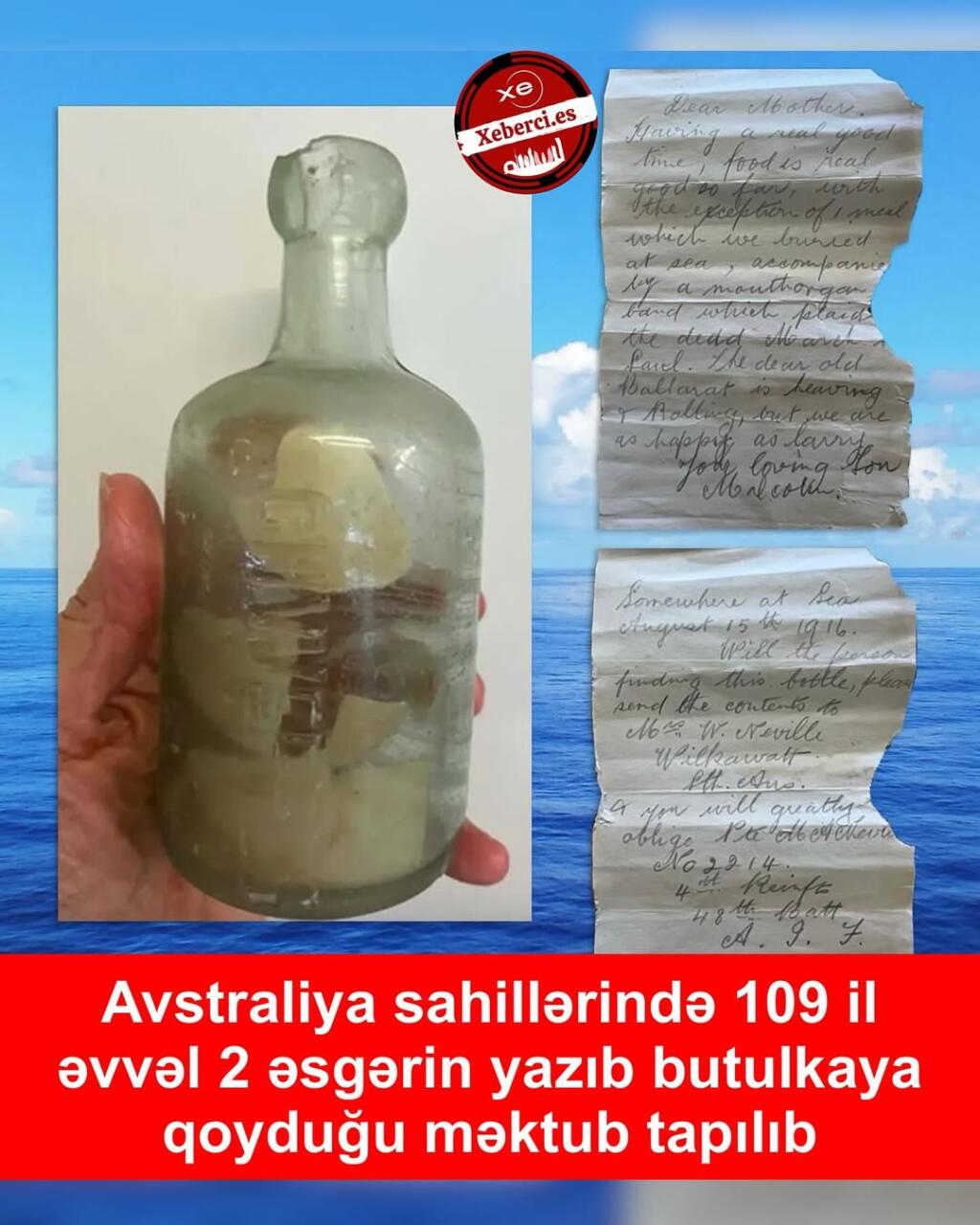 Avstraliya sahillərində tapılan şüşə butulkadan I Dünya Müharibəsində iştirak etmiş iki əsgərin 1916-cı ildə yazdığı məktub üzə çıxıb.