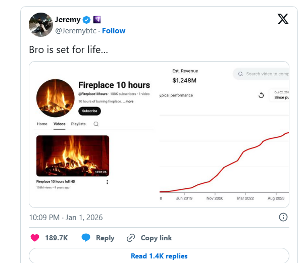 Təxminən 9 il əvvəl paylaşılan video yanan kamin görüntüsü, odun səsi, sabit kamera bucağı və sakit atmosferdən ibarətdir. Heç bir süjet, ssenari və ya insan fiquru olmayan bu sadə məzmun insanların evdə və ya ofisdə rahat bir mühit yaratmaq ehtiyacını qarşılayıb. Nəticədə video bu günə qədər 156 milyondan çox baxış toplayıb.