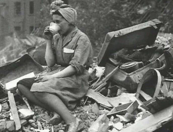 Dağıntılar arasında çay keyfi (1940): 1940-cı ilin iyun ayında İngiltərənin London şəhərində bir qadın dağıntılar arasında oturub çay içir.