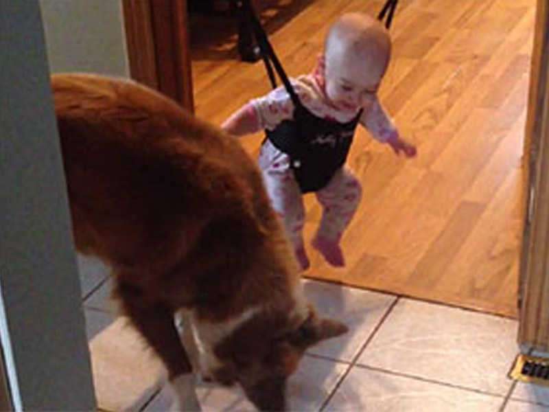 Balaca hələ yeriməyi bilməsə də, köpəyin hərəkətlərini təkrarlayır.