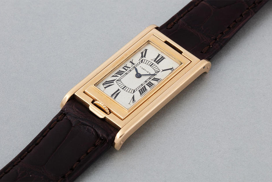 "Cartier Tank Basculante". Qol saatı. 750 əyarlı qızıl. Est.: 25-35 min frank (1945-ci il)